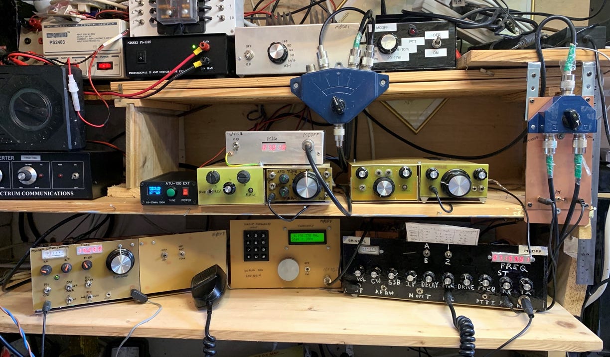 It has changed quite a few times over the years but I think this one is more or less settled……..maybe!- NO not yet. Above right is the latest incarnation of the shack, with all homebrew equipment (well nearly).