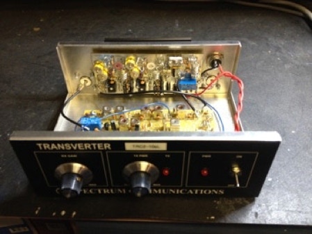 Below are 3 photographs of the Spectrum Communications TRC2-10sL transverter. Input is from the Walford Minster above when operating on 10m. This transverter operates TX switching via an RF switch with a front panel TX indicator. The transverter includes a linear amplifier to give about 20 watts output on 2m, this amplier can have its gain varied from a front panel control. On receive there is an rf amplifier whose gain can be altered from the front panel.